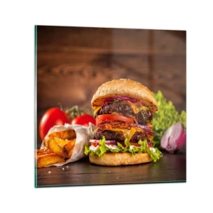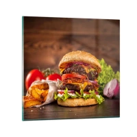Ceas de perete - Ceas pe sticlă - Burger suculent cu toppinguri pe fundal de lemn - 30x30cm - Fruct interzis - Decorațiune modernă pentru perete pentru living, bucătărie și dormitor ARTTOR