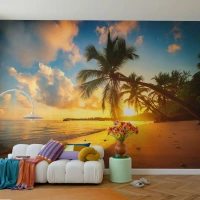Tapet Standard Eco - Plajă tropicală cu palmieri la apus - 100x70cm - Visul din Caraibe - Decorațiune modernă pentru perete pentru living și dormitor ARTTOR