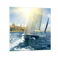 Ceas de perete - Ceas pe sticlă - Bărci cu pânze pe fundalul unui oraș de coastă însorit - 30x30cm - E timpul să părăsim orașul - Decorațiune modernă pentru perete pentru living, bucătărie și dormitor ARTTOR