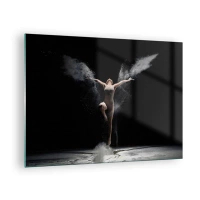 Tablou pe sticlă - O dansatoare în nori de pudră pe un fundal negru - 70x50cm - Elfii există - Decorațiune modernă pentru perete pentru living și dormitor ARTTOR