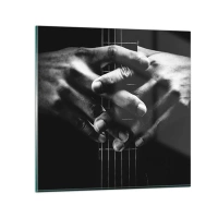 Ceas de perete - Ceas pe sticlă - Prim-plan cu mâini care țin gâtul unei chitare în alb și negru - 30x30cm - Rugăciunea artistului - Decorațiune modernă pentru perete pentru living, bucătărie și dormitor ARTTOR