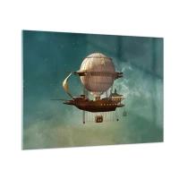 Tablou pe sticlă - Un dirijabil zburător cu o casă în stil retro pe cer - 70x50cm - Jules Verne vă transmite salutări - Decorațiune modernă pentru perete pentru living și dormitor ARTTOR