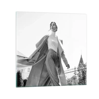 Ceas de perete - Ceas pe sticlă - O femeie elegantă în mișcare pe fundalul arhitecturii urbane - 30x30cm - Vii cu mine? - Decorațiune modernă pentru perete pentru living, bucătărie și dormitor ARTTOR