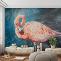 Tapet Standard Eco - Un flamingo pe fundalul unei compoziții picturale în nuanțe de albastru. - 100x70cm - Decorativ prin natură - Decorațiune modernă pentru perete pentru living și dormitor ARTTOR