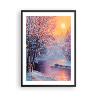Poster în ramă neagră - Peisaj de iarnă cu un râu în strălucirea soarelui apus - 50x70cm - Culorile iernii - Decorațiune modernă pentru perete pentru living și dormitor ARTTOR