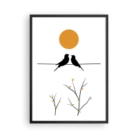 Poster în ramă neagră - Două păsări pe o creangă cu un soare portocaliu în fundal - 50x70cm - Seară cu privighetori - Decorațiune modernă pentru perete pentru living și dormitor ARTTOR