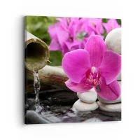 Ceas de perete - Ceas pe sticlă - Orhidee mov, bambus și pietre lângă sursa de apă - 30x30cm - Te odihnești deja - Decorațiune modernă pentru perete pentru living, bucătărie și dormitor ARTTOR
