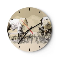 Ceas de perete - Ceas pe sticlă - Un motiv de desene animate cu fermieri care lucrează într-un câmp de orez în nuanțe de bej. - 30x30cm - O recoltă reușită - Decorațiune modernă pentru perete pentru living, bucătărie și dormitor ARTTOR