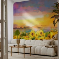 Tapet Standard Eco - Un câmp de floarea-soarelui în razele soarelui care apune - 100x70cm - Soarele însuși a coborât pe pământ - Decorațiune modernă pentru perete pentru living și dormitor ARTTOR