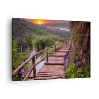 Tablou pe pânză Canvas - Un pod cu vedere la cascade la apus - 70x50cm - Frumusețe de necrezut - Decorațiune modernă pentru perete pentru living și dormitor ARTTOR