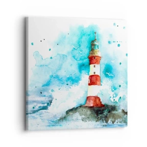 Tablou pe sticlă - Un far înconjurat de valuri ale mării, în stil acuarelă - 70x50cm - Unitatea forțelor naturii - Decorațiune modernă pentru perete pentru living și dormitor ARTTOR