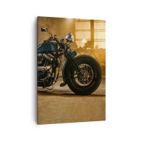 Tablou pe sticlă - Fotografie atmosferică a unei motociclete clasice într-un garaj - 70x50cm - Pot să fac totul - Decorațiune modernă pentru perete pentru living și dormitor ARTTOR