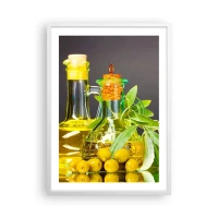 Poster în ramă albă - Natură moarte cu măsline și ulei - 50x70 cm