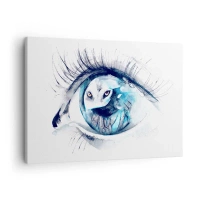 Tablou pe pânză Canvas - Un ochi cu imaginea unei bufnițe în nuanțe de albastru în acuarelă - 70x50cm - Ochi în ochi cu sălbăticia - Decorațiune modernă pentru perete pentru living și dormitor ARTTOR