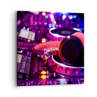 Tablou pe pânză Canvas - Căști DJ pe o consolă cu iluminare neon - 70x50cm - Înainte de a începe distracția - Decorațiune modernă pentru perete pentru living și dormitor ARTTOR