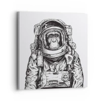 Tablou pe sticlă - Schiță a unei maimuțe într-un costum de astronaut pe un fundal alb - 70x50cm - Evoluție alternativă - Decorațiune modernă pentru perete pentru living și dormitor ARTTOR