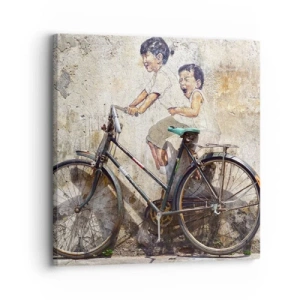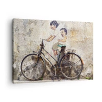 Tablou pe sticlă - O pictură murală cu o bicicletă și figuri de copii pe un fundal de perete. - 70x50cm - Adevărat sau fals? - Decorațiune modernă pentru perete pentru living și dormitor ARTTOR