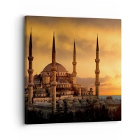 Tablou pe sticlă - Moscheea Albastră pe fundalul apusului de soare - 70x50cm - Dumnezeu este mare - Decorațiune modernă pentru perete pentru living și dormitor ARTTOR