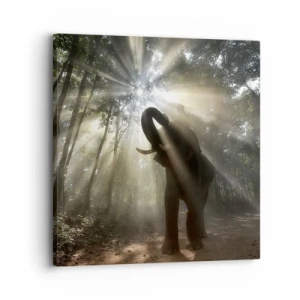 Tablou pe pânză Canvas - Un elefant în pădure, înconjurat de raze de lumină în ceața dimineții - 70x50cm - Sub o stea norocoasă - Decorațiune modernă pentru perete pentru living și dormitor ARTTOR