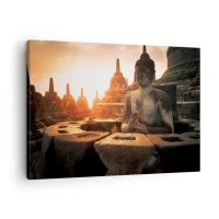 Tablou pe pânză Canvas - Statuia lui Buddha la Templul Borobudur la apus - 70x50cm - Vreme de mare înțelepciune - Decorațiune modernă pentru perete pentru living și dormitor ARTTOR