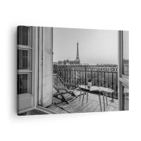 Tablou pe pânză Canvas - Vedere a Turnului Eiffel de la balcon cu șezlonguri și o masă - 70x50cm - După-amiază pariziană - Decorațiune modernă pentru perete pentru living și dormitor ARTTOR