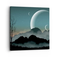 Tablou pe pânză Canvas - Munți încețoșați cu lună și un copac singuratic - 70x50cm - Carnavalul unei nopți înstelate - Decorațiune modernă pentru perete pentru living și dormitor ARTTOR
