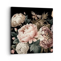 Tablou pe pânză Canvas - Un buchet de flori roz și fluturi pe fundal negru - 70x50cm - În stil baroc - Decorațiune modernă pentru perete pentru living și dormitor ARTTOR